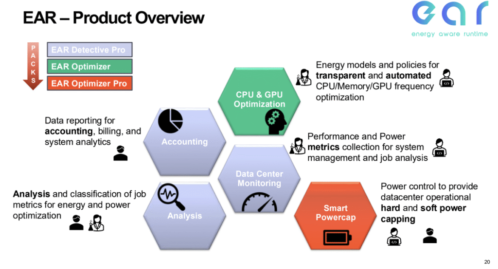 EAR (Energy Aware Runtime) is a modular, full-stack software platform designed to monitor, analyze, and optimize energy consumption across complex HPC and AI environments. Whether you need basic visibility or advanced cluster-wide control, EAR has you covered.